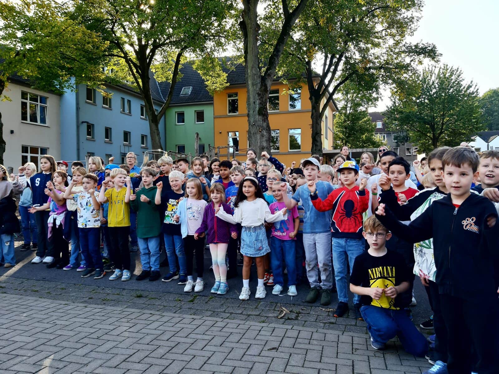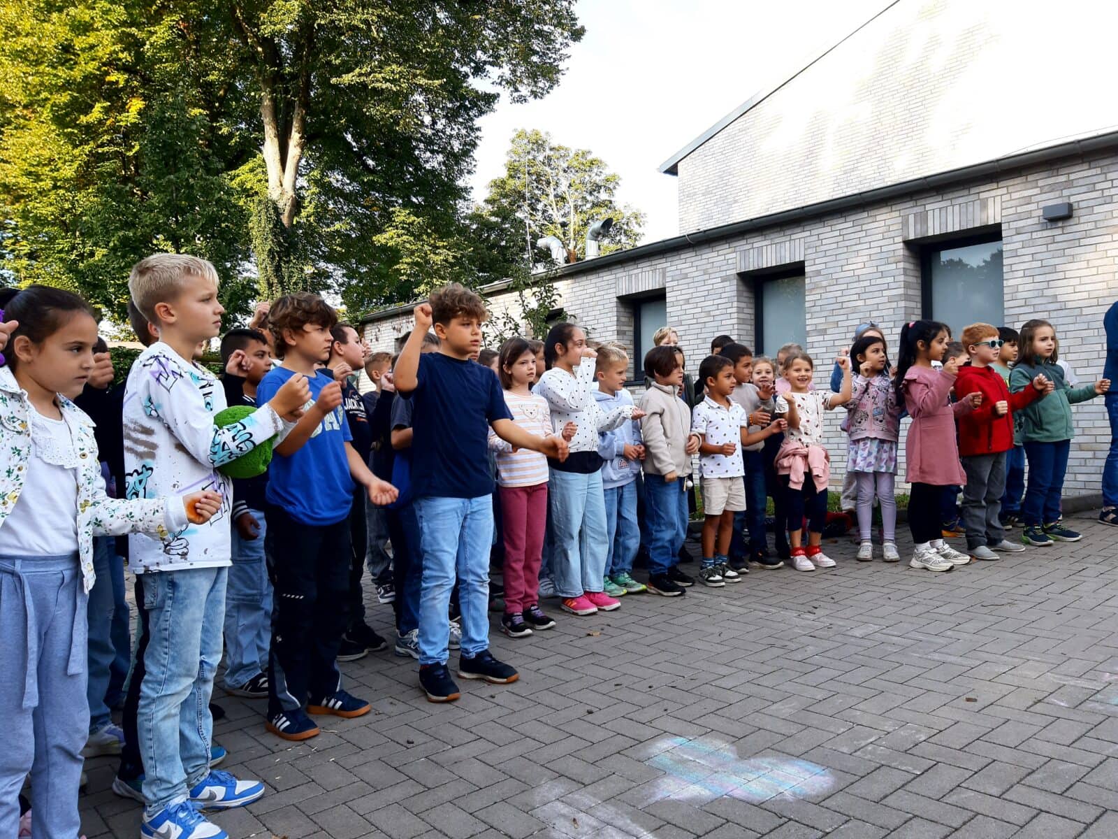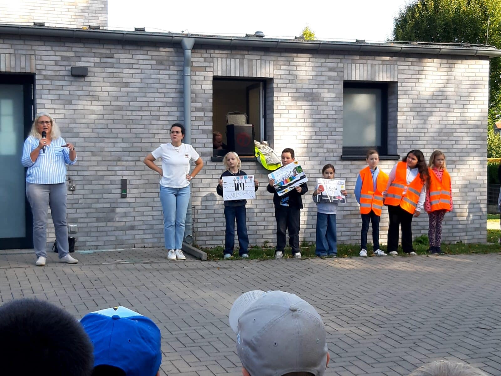 Frau Droste eröffnete am 19.09.2025 mit erklärenden Worten unsere Aktion „Zu Fuß zur Schule“. Danach sangen wir gemeinsam das Lied „Ich kann zu Fuß zur Schule gehen“ und liefen unsere Laufmeile ab.
