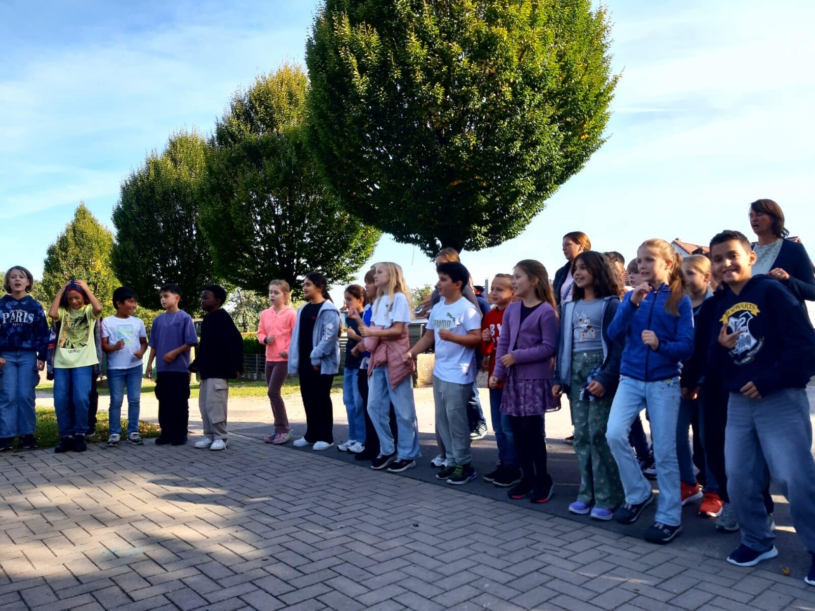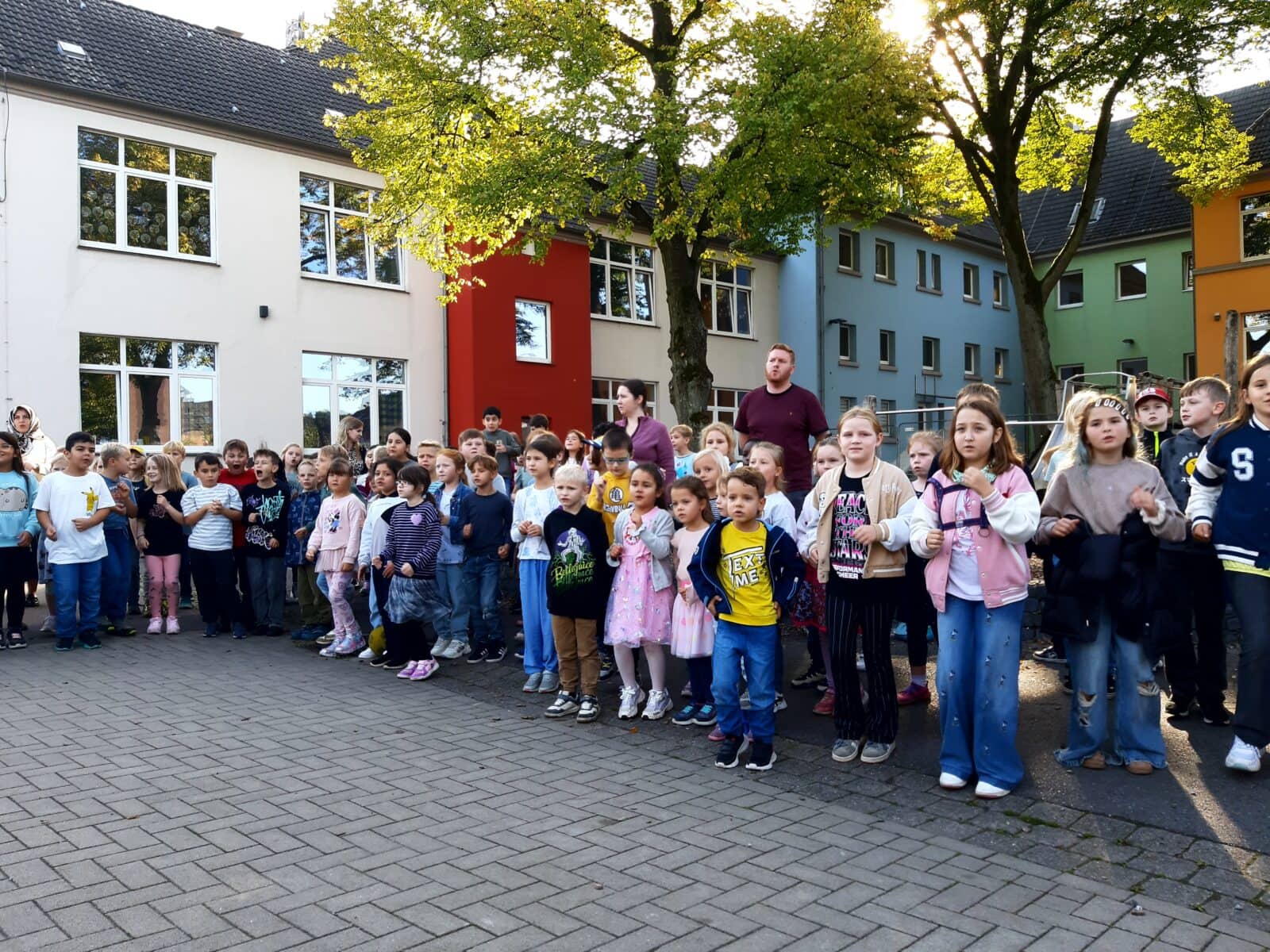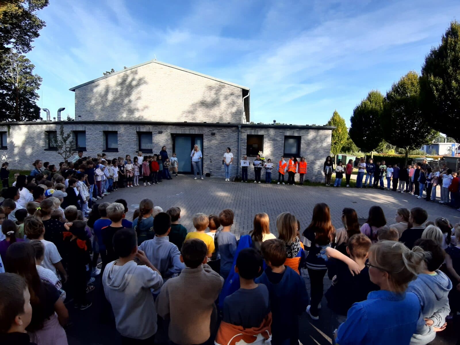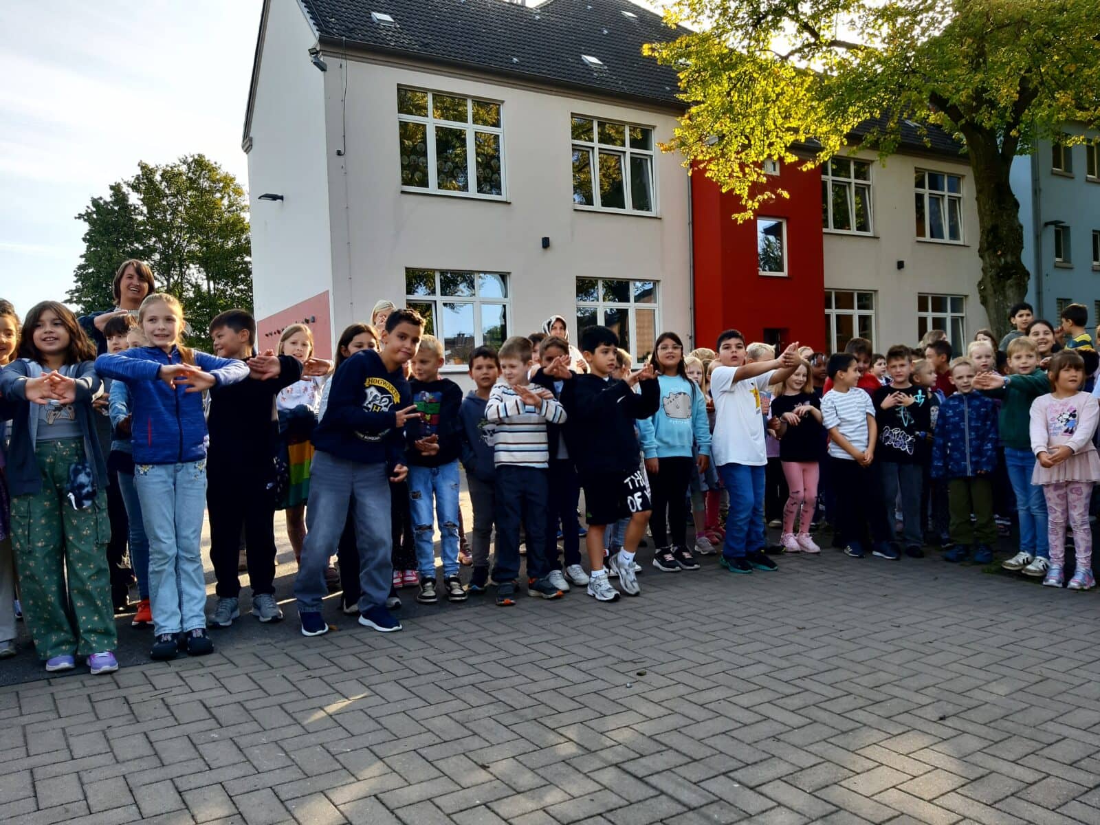 Frau Droste eröffnete am 19.09.2025 mit erklärenden Worten unsere Aktion „Zu Fuß zur Schule“. Danach sangen wir gemeinsam das Lied „Ich kann zu Fuß zur Schule gehen“ und liefen unsere Laufmeile ab.