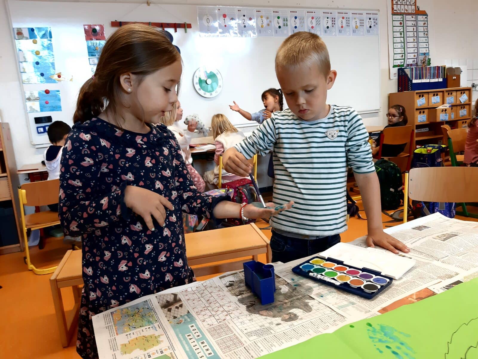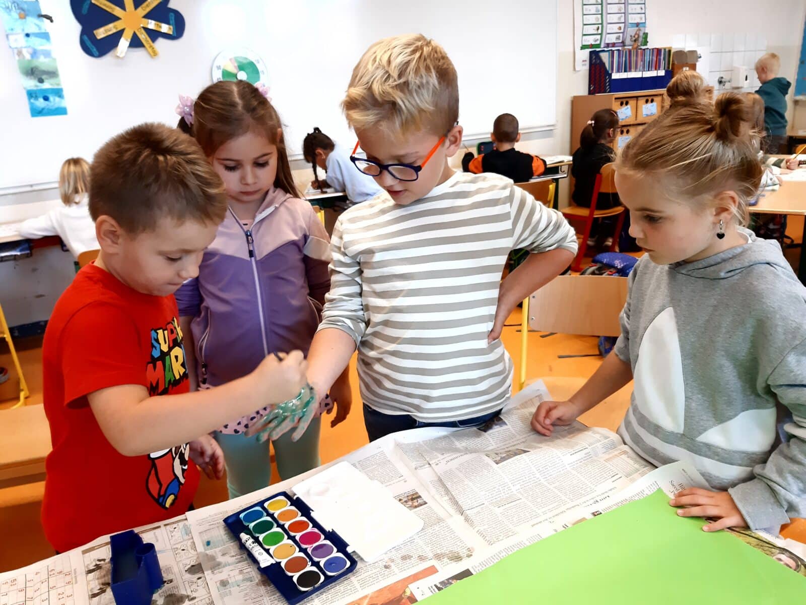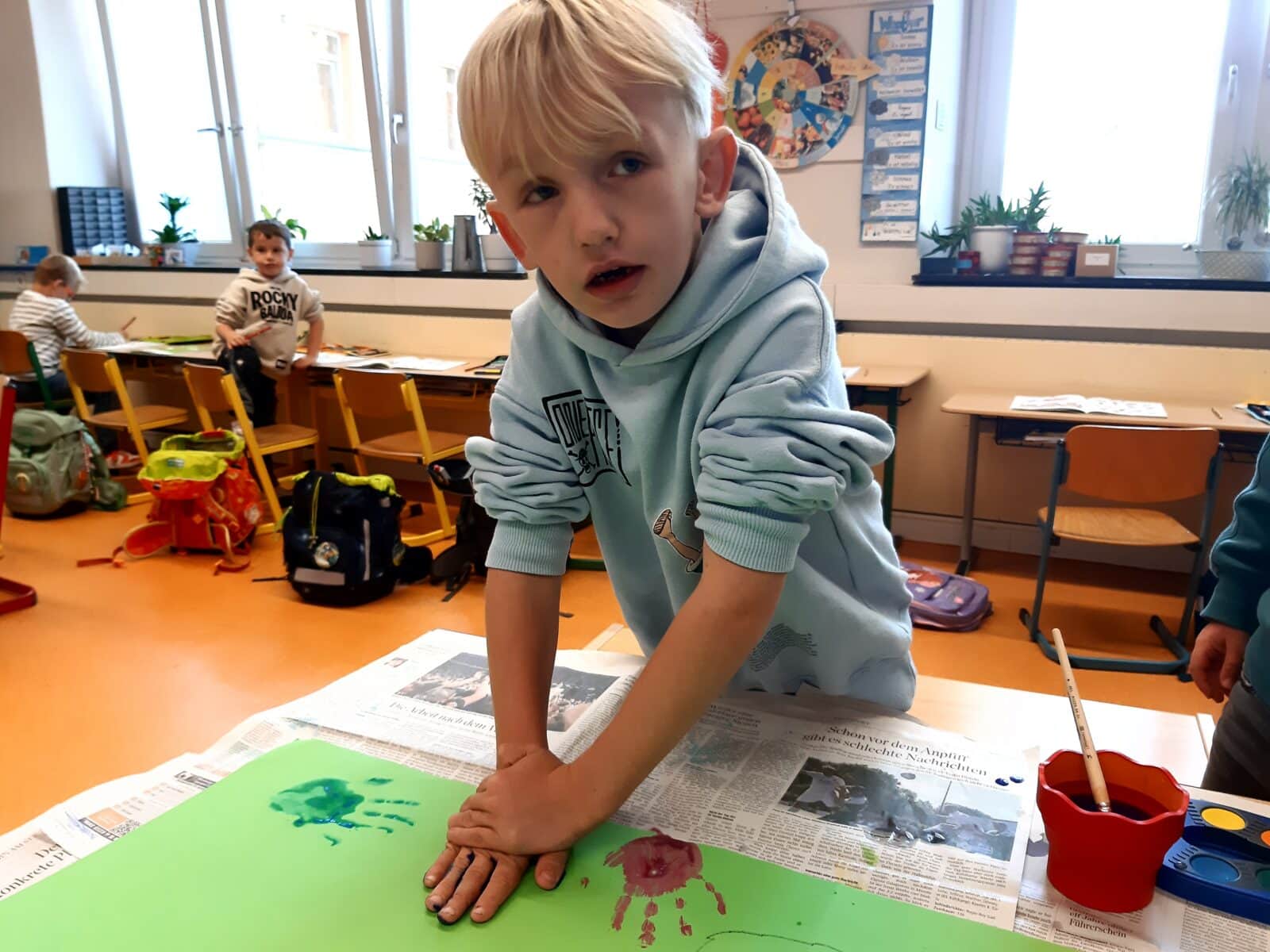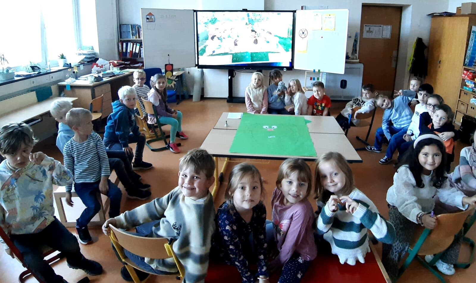 Hier wird schnell klar, dass Teilen, Helfen, Trösten und Zusammenhalten das kleine WIR und damit unsere Klassengemeinschaft stärken. Mit jeder helfenden Aktion wächst unser WIR. Anfangs sah unser kleines WIR auf dem Plakat noch aus wie eine grüne Kartoffel. Aber mittlerweile hat unser WIR schon Arme, Ohren, Augen und sogar eine Nase. Bald ist es richtig groß und stark.